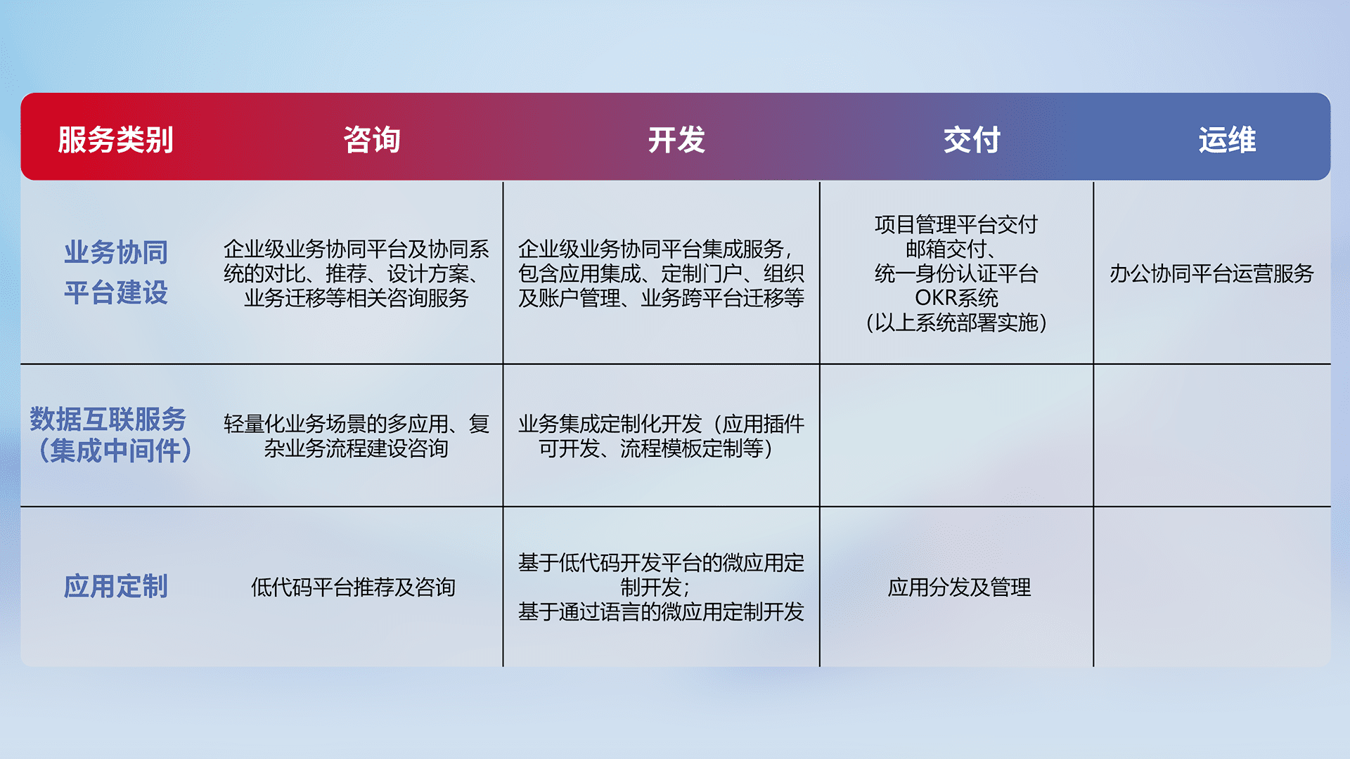 针对钉钉、、、企微、、、、IDaas等平台级产品提供产品的规划、、、、方案、、、、交付、、、、定制化开发等服务,,,,实现如统一协同办公、、、智能客户服务、、混合会议管理、、、智能数据查询、、等业务场景,,,,实现数字化转型。。。